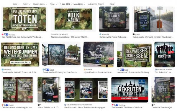 E dire che, per smentire l’idea che si tratti di pubblicità che circolano da oggi, basta saper usare i motori di ricerca. Questo è quanto viene fuori se cercate “pubblicità esercito” in tedesco restringendo la ricerca per immagini a un periodo dal 2010 al 2020, ben prima dell’invasione russa dell’Ucraina: