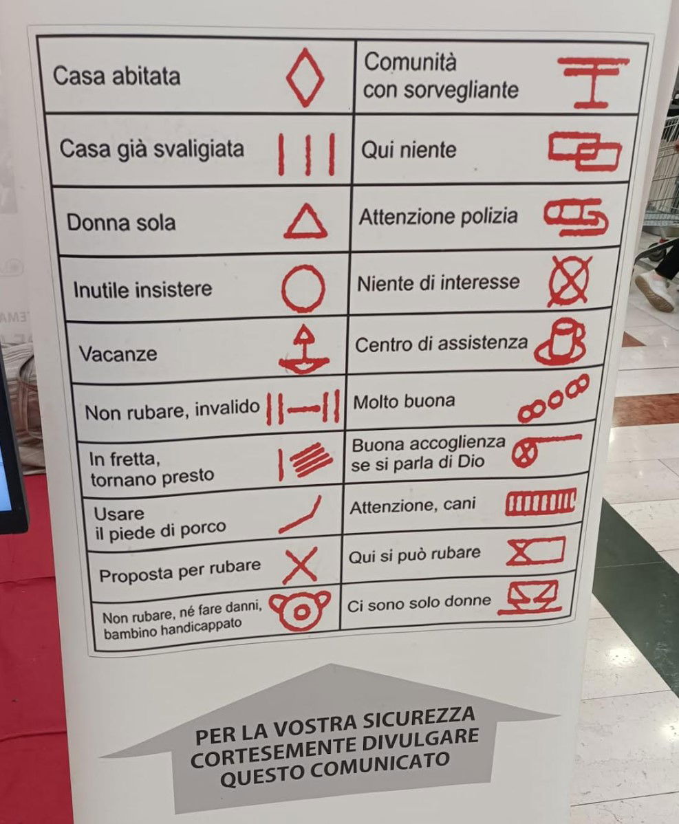 Immagine che ricorda altre che negli anni sono circolate, quelle dei famosi “segni degli zingari” anche chiamati il “codice degli zingari”, leggenda urbana che si può far risalire addirittura agli anni Settanta del secolo scorso.