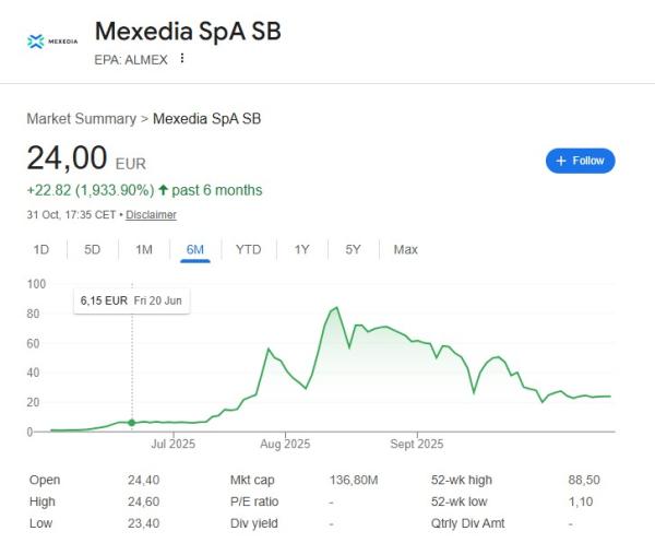 L’azione di cui si parla è quella dell’azienda Mexedia, che curiosamente già a settembre 2025 è stata sospesa dalla borsa di Parigi per sospetto di manipolazione. Il 1 ottobre La Stampa titolava: