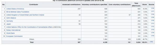 E guardando la tabella qui sopra appare evidente come Bill Gates abbia fatto il 9% delle donazioni all’OMS, non il 51%. Sostenere che sia lui a determinare le politiche dell’Organizzazione Mondiale della Sanità significa dare a intendere al proprio pubblico che il 74,4% (ho tolto anche il 15,4 degli Stati Uniti, visto quanto dichiarato da Trump) dei finanziatori dell’OMS non abbia voce in capitolo.