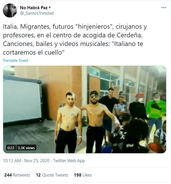 NON C’È LIMITE AL PEGGIO. Clandestini nordafricani nel centro di accoglienza in Sardegna, spunta un video musicale (!) con un bel messaggio: “Italiani, vi tagliamo la gola”. Congratulazioni al duo Conte-Lamorgese per l’umiliazione senza fine inflitta al popolo italiano accogliendo chi ci porta la guerra in casa.