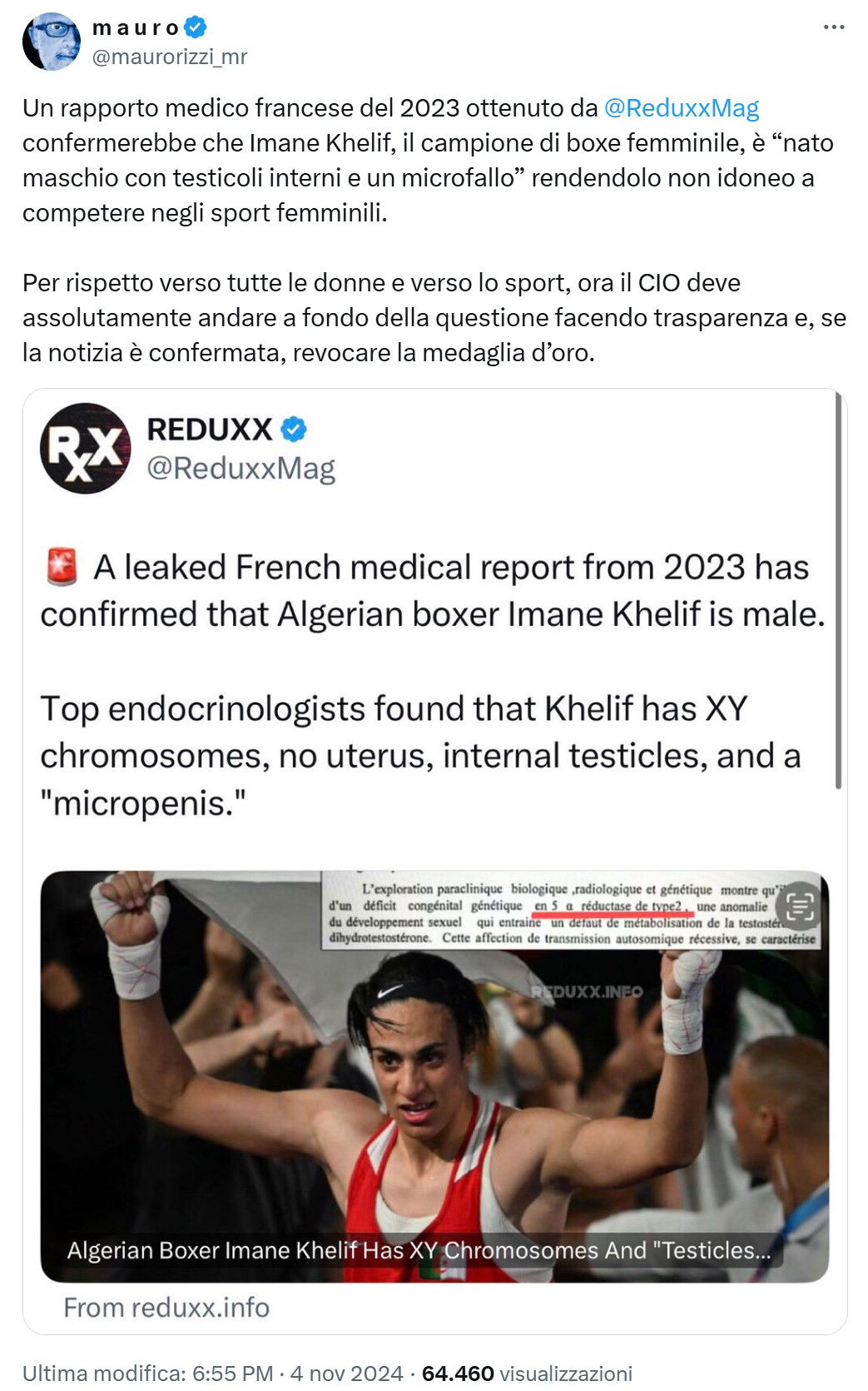 Un rapporto medico francese del 2023 ottenuto da @ReduxxMag confermerebbe che Imane Khelif, il campione di boxe femminile, è “nato maschio con testicoli interni e un microfallo” rendendolo non idoneo a competere negli sport femminili. Per rispetto verso tutte le donne e verso lo sport, ora il CIO deve assolutamente andare a fondo della questione facendo trasparenza e, se la notizia è confermata, revocare la medaglia d’oro.