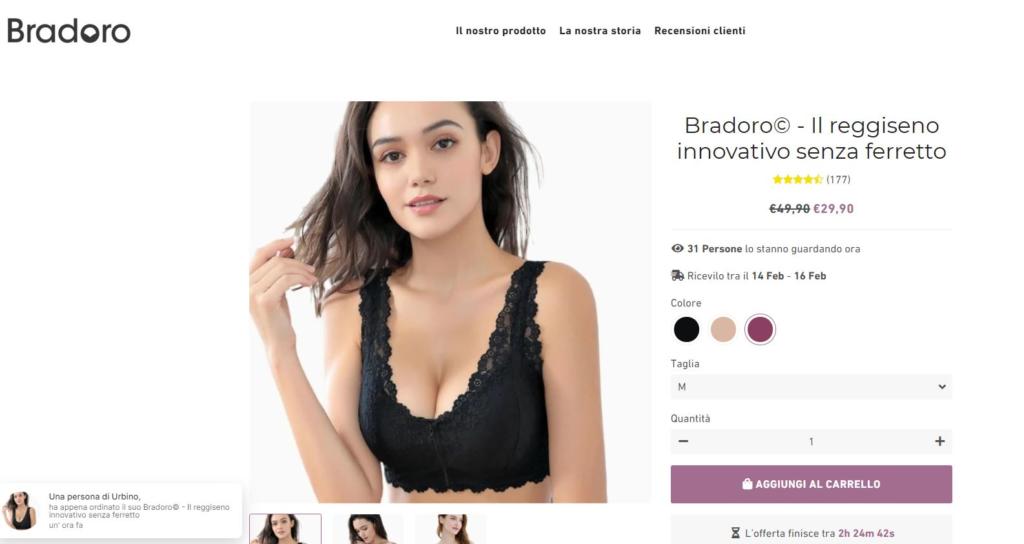 Quello che vedete sopra sono tutte bugie, bugie vergognose, l’azienda esiste solo per vendervi un prodotto di bassissimo costo, che non ha alcun tipo di effetto nella prevenzione del cancro; e nessun soldo verrà donato alla lega contro il cancro al seno. Chi ha creato il sito e la pubblicità sono i soliti sparvieri che se ne infischiano completamente della realtà dei fatti. Sanno che mettendo insieme un video con una musica emozionale e delle immagini suggestive possono raggranellare clienti. State lontani da Bradoro, come anni fa vi dicevo (su Lettera43) di stare lontani da Adriana Ferrutti. Il prodotto è equipollente, sempre un reggiseno, sempre senza ferretti, sempre venduto con la tecnica di dare a intendere che altri reggiseni possano causare il cancro.