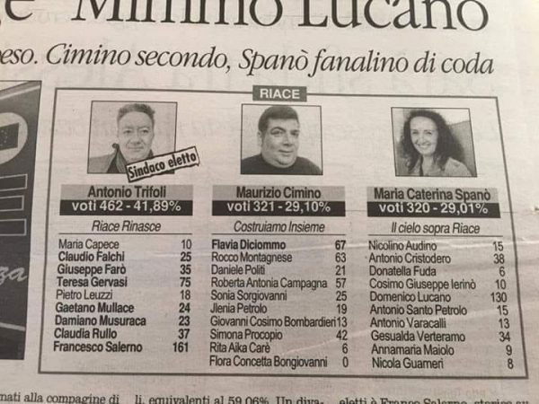 Secondo questo ritaglio di giornale (grazie a Diego che l’ha trovato) Lucano è in assoluto secondo come preferenze a Riace, dietro a Salerno, ex segretario del PD locale. Tutti gli altri candidati non hanno superato le 100 preferenze.