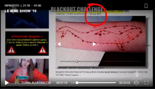 Matteo Viviani parte dal loro servizio, del 14 maggio 2017, quando per la prima volta parlarono del Blue Whale. Ci fa un sunto del servizio ci mostra screenshot di youtube (perlopiù risalenti a marzo, tenetelo bene a mente, le date sono importanti).