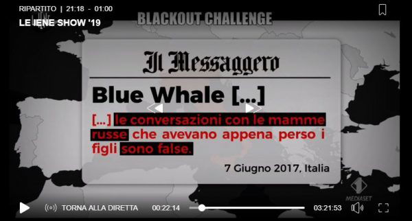 Quanto sopra discusso le Iene l’hanno usato per fare da cappello a un servizio in cui si parla di un’altra “sfida” potenzialmente mortale la Blackout challenge. Onestamente ho molte riserve su questa storia, anche questa, da fact checker, mi sembra un’invenzione mediatica. A distanza di mesi dalla morte di un giovane ancora non si hanno prove che dimostrino questa “nuova moda fra i giovani”. Selvaggia Lucarelli, attaccata pesantemente durante il programma, già a settembre 2018 avanzò i suoi dubbi. Io non ne parlerò, non oggi, vorrei che i primi a farlo fossero gli inquirenti, che per una volta fossero loro a fare chiarezza sull’allarmismo mediatico lanciato dalle iene.