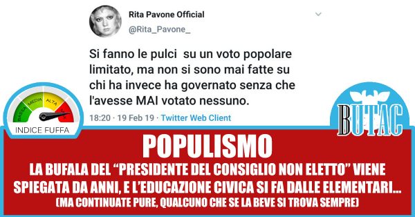 A mio avviso tweet come questo sono lo specchio dell’analfabetismo funzionale e di ritorno dilaganti nel nostro Paese. Sono almeno cinque anni che questa storia del governo non votato dai cittadini circola. E sono almeno cinque anni che è stata sbugiardata in lungo e in largo; che ci siano ancora italiani che non si rendono conto di quanto sia una cavolata mi sta pure bene, ma che a diffonderla siano anche soggetti con un largo seguito come Rita Pavone mi fa davvero cascare le braccia.