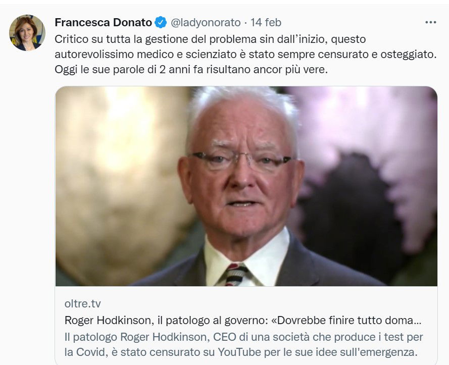 E anche noi ce ne eravamo appunto dovuti occupare a fine 2020, quando lo stesso aveva affermato che la pandemia era una farsa e che sarebbe finita in pochissimi giorni. All’epoca le realtà italiane che riportavano le sue parole (per lo più siti online e blog complottisti) sostenevano fosse il CEO di un’azienda che produceva test per COVID-19, ma era una bugia. Hodkinson all’epoca si occupava di certificazioni di disabilità, e mentiva sul suo stesso sito con un curriculum smentito dagli stessi datori di lavoro che lui citava. Insomma, siamo di fronte a un soggetto dall’affidabilità quantomeno dubbia. Come sia possibile che un europarlamentare italiano lo definisca “autorevolissimo”, ne riporti le parole, e dedichi al soggetto non uno ma ben due tweet mi lascia sconcertato. Due, sì, perché a poche ore dal primo Francesca Donato ha ritwittato con una fonte che è meglio perdere che trovare: