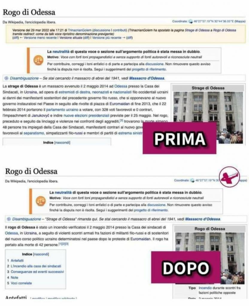 Nell’immagine allegata si vede la pagina italiana dedicata al Rogo di Odessa in due versioni, una evidentemente ritenuta quella corretta da chi condivide il post, e un’altra che sarebbe quella modificata per “cambiare la realtà”.