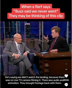 Ad esempio qui abbiamo Aldrin in compagnia di Conan O’Brien che spiega come mai non è stato visto il momento esatto in cui il modulo lunare su cui si trovavano lui e Armstrong ha toccato il suolo: si tratta di uno spezzone sfruttato dai complottisti per sostenere che Aldrin abbia ammesso che quanto abbiamo visto in TV era un falso, ma è semplice semantica. Aldrin sta spiegando che non c’erano – ovviamente – telecamere per inquadrare il momento dell’allunaggio; in compenso c’erano dopo quando, una volta “allunati”, hanno passeggiato sul suolo lunare.