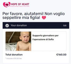 Ci è stata segnalata l’ennesima raccolta fondi di dubbia provenienza, una raccolta fondi per una bimba di nome Sofia, raccolta che a oggi pare essere arrivata a oltre 160mila euro di donazioni.
