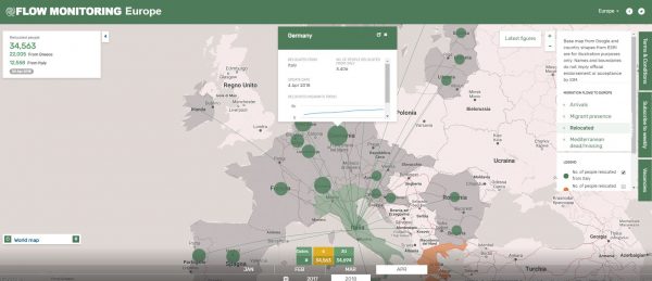 Sul sito da cui ho ricavato i precedenti numeri esistono piantine con le ricollocazioni di immigrati tra Paesi. I dati purtroppo sono incompleti, sono riportati solo quelli tra febbraio 2017 e aprile 2018, ma basta un’occhiata per accorgersi di quanti migranti arrivati nel nostro Paese venissero riallocati in altri paesi europei.