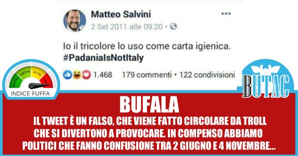 Si tratta di un falso, creato apposta per fare schiumare di rabbia i detrattori del vicepremier. EDIT: come fa notare la sempre brava Marisa a certificare il falso c’è anche l’uso dell’hashtag, che nel 2011 non c’era su Facebook, sono stati introdotti solo nel 2013. Un falso che però parte da qualcosa di reale. C’era un tempo una pagina Facebook che si chiamava “Io il tricolore lo uso così”, pagina da pochissimi follower (oggi chiusa). Uno dei frequentatori aveva pubblicato l’immagine del rotolo di carta igienica fatto con la bandiera italiana. Ne era nata una polemica in quanto un assessore leghista di Malnate aveva commentato l’immagine con queste parole: