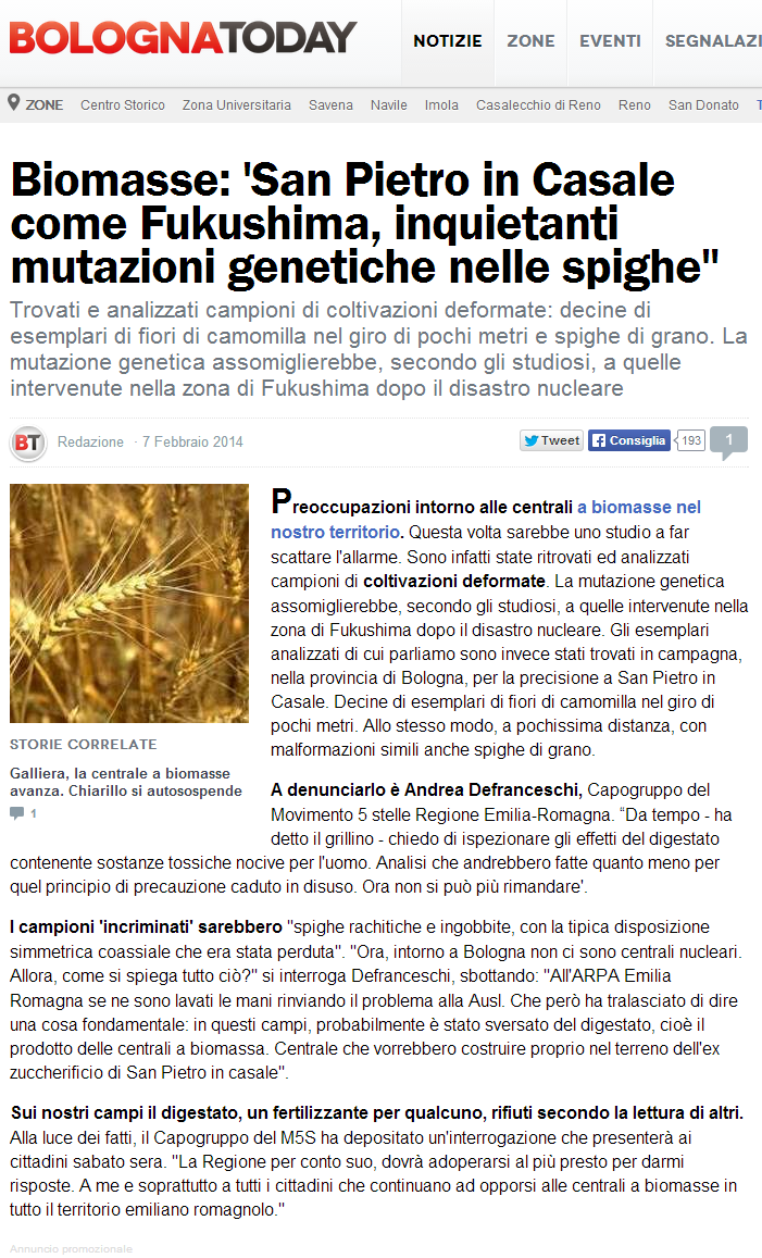 Su BolognaToday è comparso un articolo a dir poco inquietante: “San Pietro in Casale come Fukushima, inquietanti mutazioni genetiche nelle spighe”.