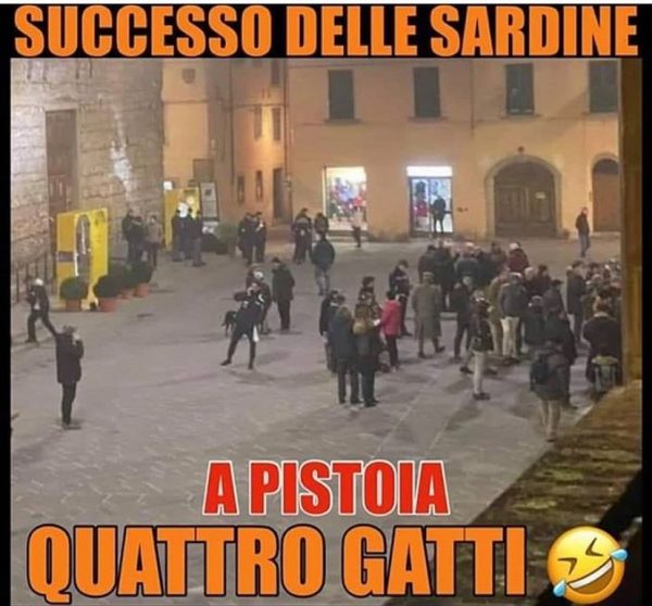 La foto mostra la piazza in cui si sarebbero dovute incontrare le sardine il 4 gennaio 2019, ed è una piazza decisamente vuota. BUTAC, come sempre, è poco interessato alla politica in quanto tale, ma solo alla verifica dei fatti, e non posso smentire quella foto: è vero, il 4 gennaio a Pistoia c’erano pochissime persone in piazza. Quello però che il Gruppo Gnazzzio non racconta, e la cosa non mi sorprende affatto visto il loro modus operandi, è che il raduno delle sardine del 4 gennaio era stato annullato dagli stessi organizzatori nazionali. Come riportava la Repubblica il 3 gennaio: