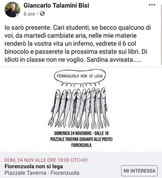 Fiorenzuola non si Lega – Io sarò presente. cari studenti, se becco qualcuno di voi, da martedì cambiate aria, nelle mie materie renderò la vostra vita un inferno, vedrete il 6 col binocolo e passerete la prossima estate sui libri. Di idioti in classe non ne voglio. Sardina avvisata…..