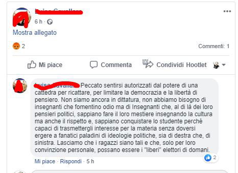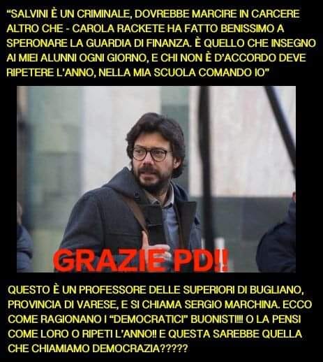 “Salvini è un criminale, dovrebbe marcire in carcere altro che – Carola Rackete ha fatto benissimo a speronare la Guardia di Finanza. È quello che insegno ai miei alunni ogni giorno, e chi non è d’accordo deve ripetere l’anno, nella mia scuola comando io.” Questo è un professore delle superiori di Bugliano, provinacia di varese, e si chiama Sergio Marchina, ecco come ragionano i “democratici” buonisti!!! O la pensi come loro o ripeti l’anno!! E questa sarebbe quella che chiamiamo democrazia