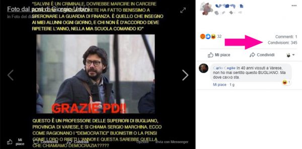 Il post che mi avete segnalato, con 345 condivisioni da una bacheca qualunque… e un solo commento, lunico che forse si fa venire qualche dubbio: ” In 40 anni vissuti a Varese non ho mai sentito BUGLIANO. Ma dove ca**o sta?”