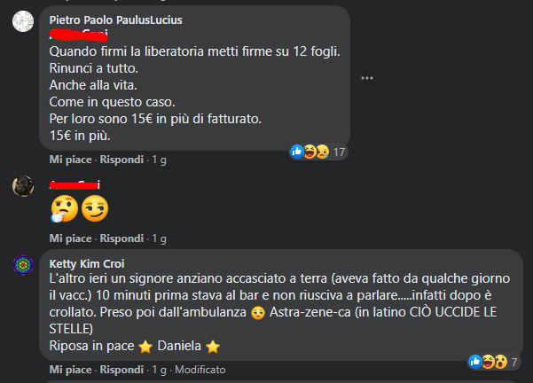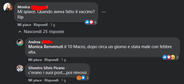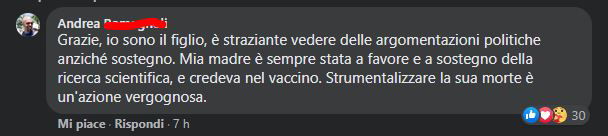Tra i tanti commenti compaiono anche quelli del figlio della signora Daniela che specifica subito che la sua morte non ha nulla a che vedere col vaccino: