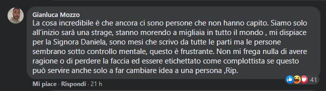 A scrollare i commenti si scopre anche chi è stato a fare lo screenshot originale e a diffonderlo, il quale poi – vergognandosi della tam tam generato o avendo paura di qualche ritorsione legale – ha rimosso e cancellato. Purtroppo il danno era fatto, condividendo quanto sopra su profili pieni di contatti di gentaglia novax era ovvio che tutti sarebbero andati sulla bacheca della povera Daniela, e dire che chi ha fatto il casino sarebbe pure giornalista… Di questa persona evito di mostrare nome e cognome, i familiari della povera Daniela sanno perfettamente di chi si tratta, un soggetto che in passato era già salito agli onori della cronaca per altri motivi e che sulla sua bacheca diffonde disinformazione di noti antivaccinisti, ovviamente sostenendo di non esserlo. Sia chiaro, potevo lasciare nomi e cognomi di tutti gli screenshot qui sopra, i loro commenti sono pubblici, ma ho scelto di tenere aperti solo quelli che non meritano altro che essere esposti per quanto sono stati incivili e sciacalli.