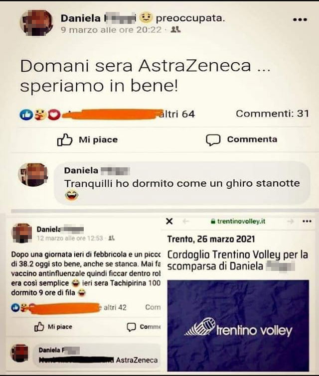 Altro caso di sciacallaggio orrendo, ormai ci dovrei aver fatto il callo e invece ogni volta che ne segnalate uno mi sale lo sconforto, penso alla famiglia della persona sfruttata per l’occasione, penso a come si sentiranno quando capiranno che gli screenshot alla pagina del loro caro gireranno in rete per mesi per sostenere la tesi che vuole il vaccino colpevole della sua scomparsa.