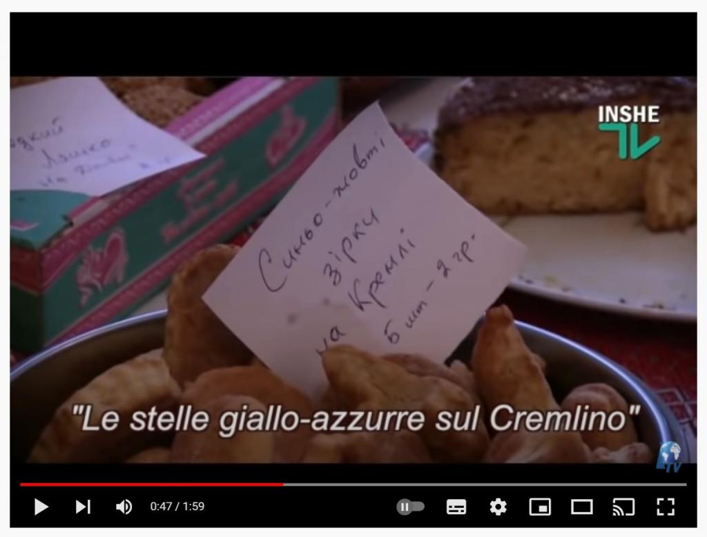 Ci è stato spiegato che un cartello del genere non ha obbligatoriamente un significato aggressivo nei confronti della Russia, perché la parola Cremlino significa fortezza. Pertanto questo nome non indica necessariamente un desiderio di conquistare la Russia, come invece sostiene la voce di Chiesa nel video, men che meno un’azione violenta. Il cartello col nome del dolce si potrebbe interpretare anche in senso patriottico (“stelle sul NOSTRO Cremlino, ovvero l’Ucraina agli Ucraini”).