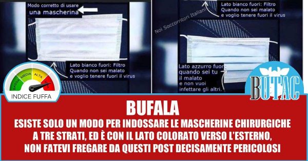 Cavolate. Esiste solo un modo per indossare una mascherina di quel genere, ed è col lato colorato verso l’esterno. Chiunque vi dica che si può indossare in due modi vi sta prendendo per i fondelli e andrebbe seriamente redarguito, perché il rischio è che invece che proteggervi facciate peggio. Il lato colorato della mascherina è quello che deve stare sull’esterno. Se la mascherina non ha colori diversi sui due lati significa che non è una mascherina a tre strati e non vi protegge granché; se ha colori diversi il filtro è nello strato centrale, il lato colorato è trattato in maniera da essere idrorepellente, quello bianco invece assorbe l’umidità che fuoriesce dai nostri polmoni.