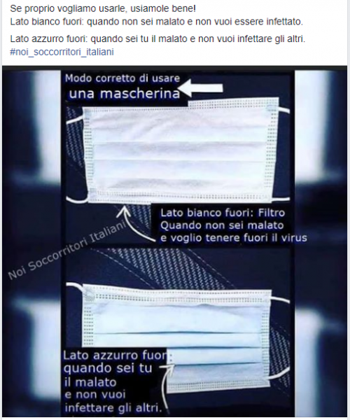 Il post mostra una mascherina chirurgica, di quelle che vediamo indossare da tanti asiatici nei filmati che arrivano dalla Cina in questi giorni. Nell’immagine viene riportato quello che si sostiene essere il modo corretto d’indossare una mascherina chirurgica.