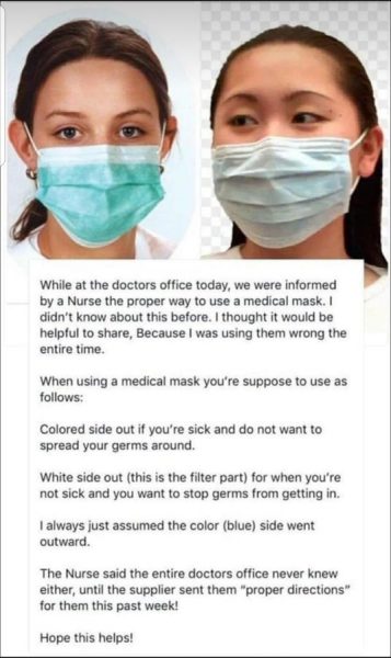 Il post mostra una mascherina chirurgica, di quelle che vediamo indossare da tanti asiatici nei filmati che arrivano dalla Cina in questi giorni. Nell’immagine viene riportato quello che si sostiene essere il modo corretto d’indossare una mascherina chirurgica.