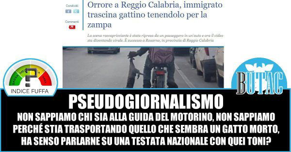L’animale è probabilmente morto, visto che resta completamente immobile in balia dell’andamento del motorino. Perché questo signore lo sta trasportando? Non lo sappiamo. Le motivazioni possono essere svariate, ma ovviamente l’unica che viene in mente dopo il titolone de il Giornale è una motivazione negativa. Siamo sicuri che il signore sia un immigrato? L’unico indizio è la mano che regge il gatto, che è scura. Ma potrebbe essere un guanto, non lo sappiamo, è impossibile definire l’immagine nel migliore dei modi per capirne di più. Quel che è certo è che c’è una persona, impossibile definire se sia o meno straniera, che sta trasportando un gatto al 99% morto, su un ciclomotore senza targa.