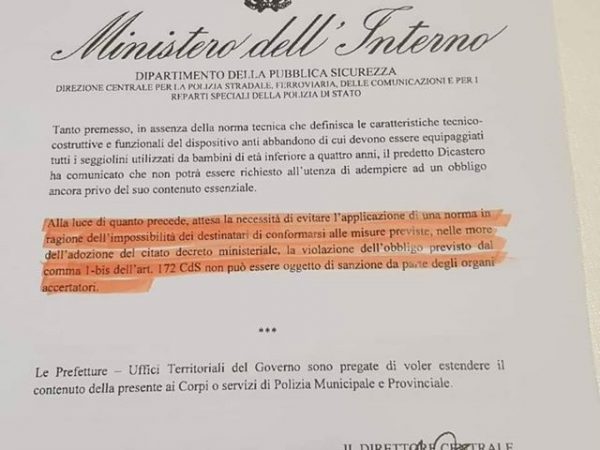 Chi leggesse questo messaggio può convincersi che non vengano applicate sanzioni sull’obbligo dei dispositivi anti abbandono. Ma si tratta di una circolare di luglio 2019, prima dell’entrata in vigore ufficiale del decreto del 2018. Il decreto è però operativo dal 7 novembre 2019, pubblicato anche sulla Gazzetta Ufficiale. Come spiega chiaramente il Ministero dei Trasporti: