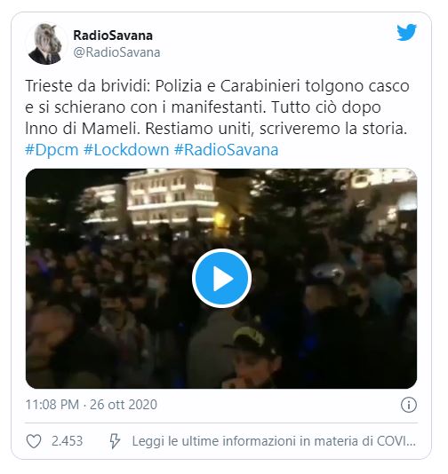 #Trieste: carabinieri si spogliano dell’assetto anti-sommossa e si schierano con i manifestanti. #LItaliaSiRibella #lockdown #Dpcm pic.twitter.com/IjMiViyZst