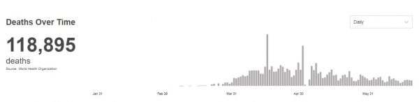 - Nel periodo tra marzo e maggio oggetto dell’analisi c’è stato un picco di morti, verificabile da chiunque. Secondo CHCA sarebbe terminato il 21 maggio rientrando nella normalità. In realtà se guardiamo il grafico dell’OMS i dati non sono ancora rientrati del tutto nella media, pur essendo diminuiti di molto i casi di morti da COVID-19.