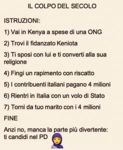 Il post mescola elementi veri e falsi in modo confuso. Se è vero che Silvia Romano si è candidata nel PD, è del tutto infondato il riferimento al marito keniota. L’insinuazione di un finto rapimento e l’indicazione del riscatto di 4 milioni sono altrettanto prive di base. Infine, la sequenza temporale degli eventi è distorta.