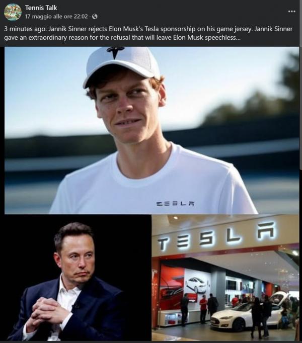 Tra post sui social network e articoli clickbait su siti di nessuna affidabilità, sono in tanti coloro che nelle ultime due settimane ci hanno segnalato la notizia secondo cui Jannik Sinner e Jasmine Paolini avrebbero rifiutato come sponsor Tesla. L’ultimo a esserci stato segnalato è questo post su Facebook: