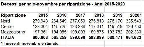 Tra il 2015 e il 2019 i morti in Italia (tra gennaio e novembre) sono stati sempre dentro i 600mila e rotti, solo nel 2015 si è superato il numero di 600mila di qualche centinaia. Nel 2020 siamo comunque con un più 10% abbondante di morti rispetto al peggiore degli ultimi sei anni. Quel 10% è COVID, lo si capisce ancora meglio guardando dove è concentrato quel dato, quasi tutto nel Nord Italia, dove tra gennaio e novembre abbiamo avuto la maggioranza dei casi di contagio. Un 10% di morti in più annuali è tanto, specie visto e considerato che i dati parziali ci raccontano di come la situazione sia andata ancora peggio a dicembre.