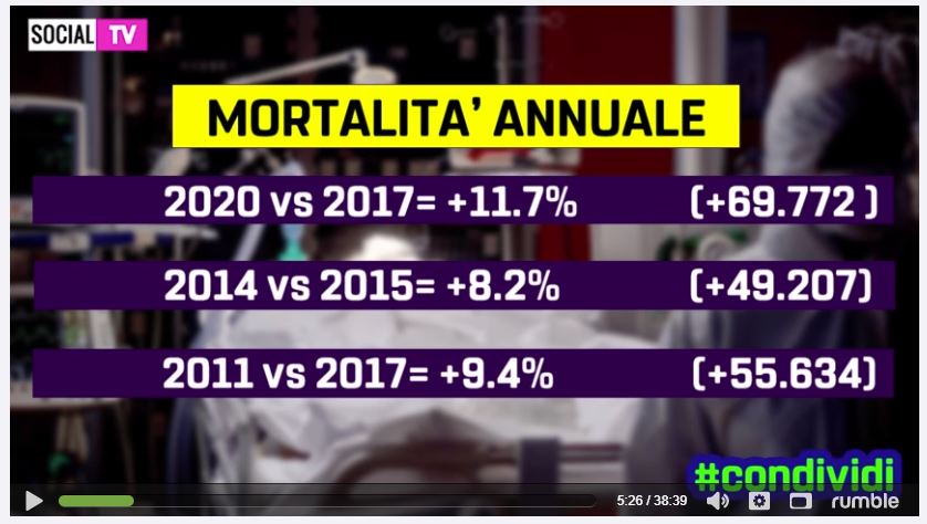 “Blangiardo è furbo, perché si dimentica di dire che nel 1944 la popolazione italiana si aggirava sui 43 milioni e che dunque perché il 2020 possa essere paragonato ai morti della seconda guerra mondiale del 1944 l’anno passato, il 2020, con quasi un terzo di popolazione in più avrebbe dovuto realizzare oltre 900mila morti. Ecco questo aumento di mortalità avrebbe potuto far gridare a una possibile pandemia. Possibile che il presidente dell’ISTAT non sappia queste cose? No, non è possibile, ma per mantenere la fake news della pandemia bisogna attaccarsi a tutto”