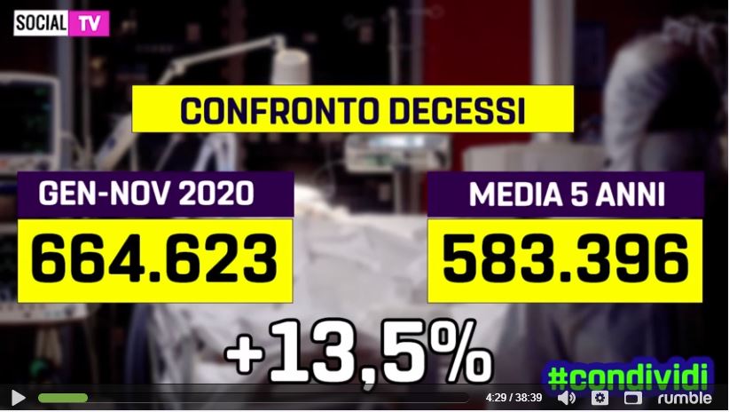 Io onestamente avendo più e più articoli sul tema morti da COVID-19 non ho voglia di ascoltare tutta la mezz’ora del suo video. Credo che questa tabella pubblicata da ISTAT coi numeri dei morti (tra gennaio e novembre) tra il 2015 e il 2019, paragonati a quelli che sono i morti certi del 2020 (sempre tra gennaio e novembre) dovrebbe bastare a farvi capire quanto vi sta prendendo per i fondelli: