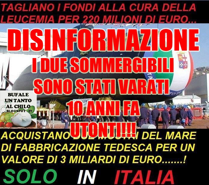 Gira questo post dove si vede uno dei momenti del varo del SMG “S.Todaro” classe U212A Todaro. Nella foto che circola in rete si racconta che lo Stato italiano ha tagliato i fondi per la lotta alla leucemia mentre in contemporanea ha speso soldi per l’acquisto di due sommergibili come quello nella foto. Trattasi di Bufala, il sommergibile Todaro, costruito nei cantieri di Muggiano dalla Fincantieri, è stato varato nel 2003, ed era stato pagato precedentemente al varo, quindi nessun collegamento tra le due cose.