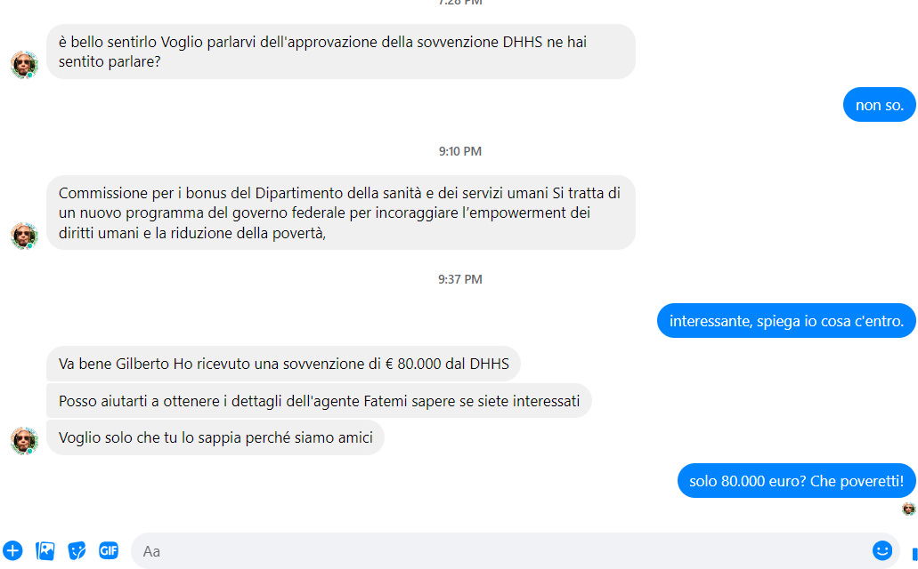 A parte l’italiano da traduttore automatico, l’amico in questione (grazie Gibbo) ha scelto di dare spago al truffatore per capire dove voleva andare a parare. La prima cosa da dire è che con DHHS ci si sta riferendo a un fantomatico “Dipartimento della salute e dei servizi umani” (ovviamente l’acronimo viene dall’inglese). Descritto così su alcuni siti: