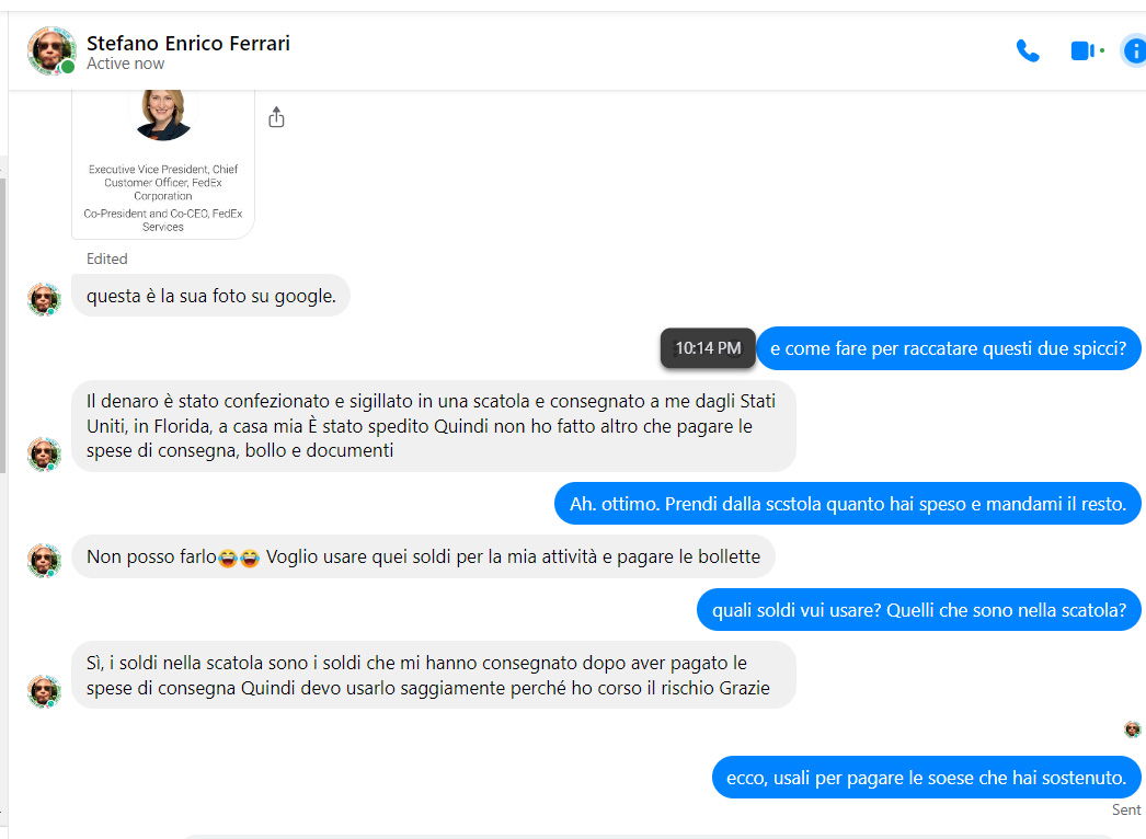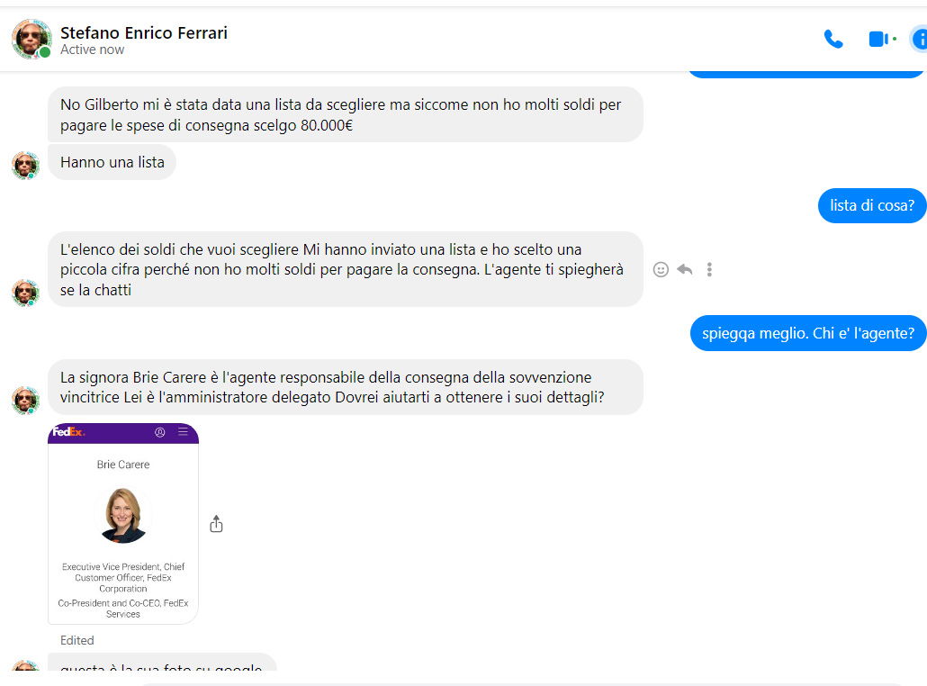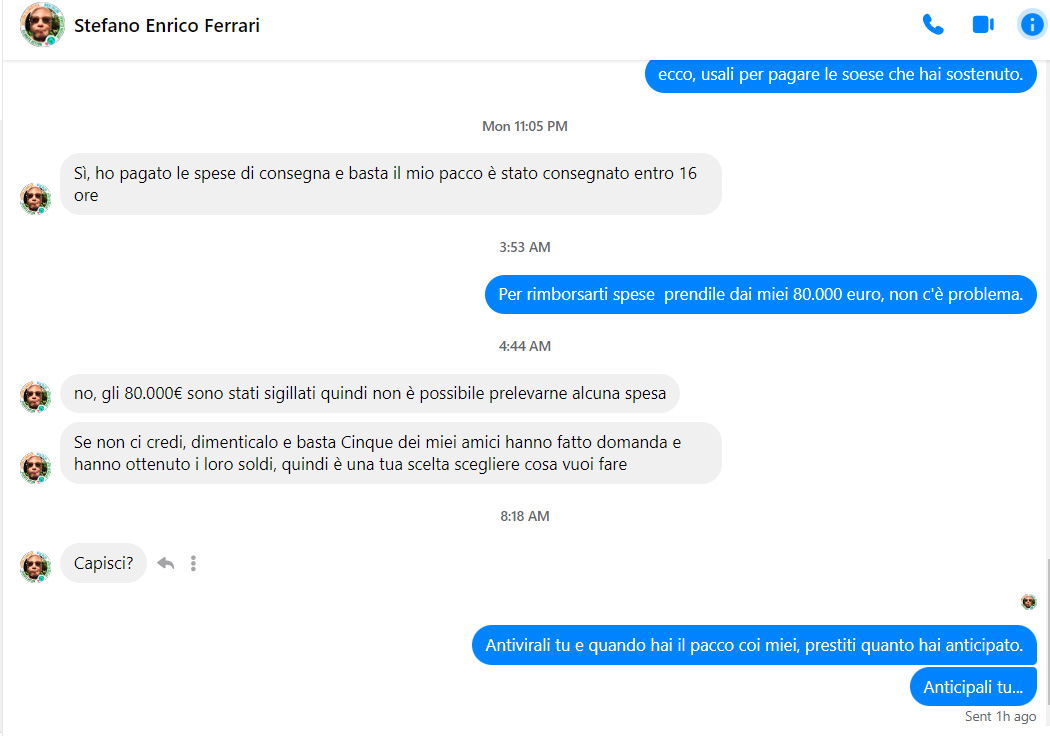 La chat è proseguita, e l’amico ci ha inviato gli screenshot perché il dialogo che ne è uscito è surreale. In pratica il truffatore, che al momento usa un profilo col nome Stefano Enrico Ferrari, sostiene di avere questi soldi sigillati in una scatola, ben 80mila euro, e che può inviarceli a casa, basta che noi paghiamo le spese di spedizione.