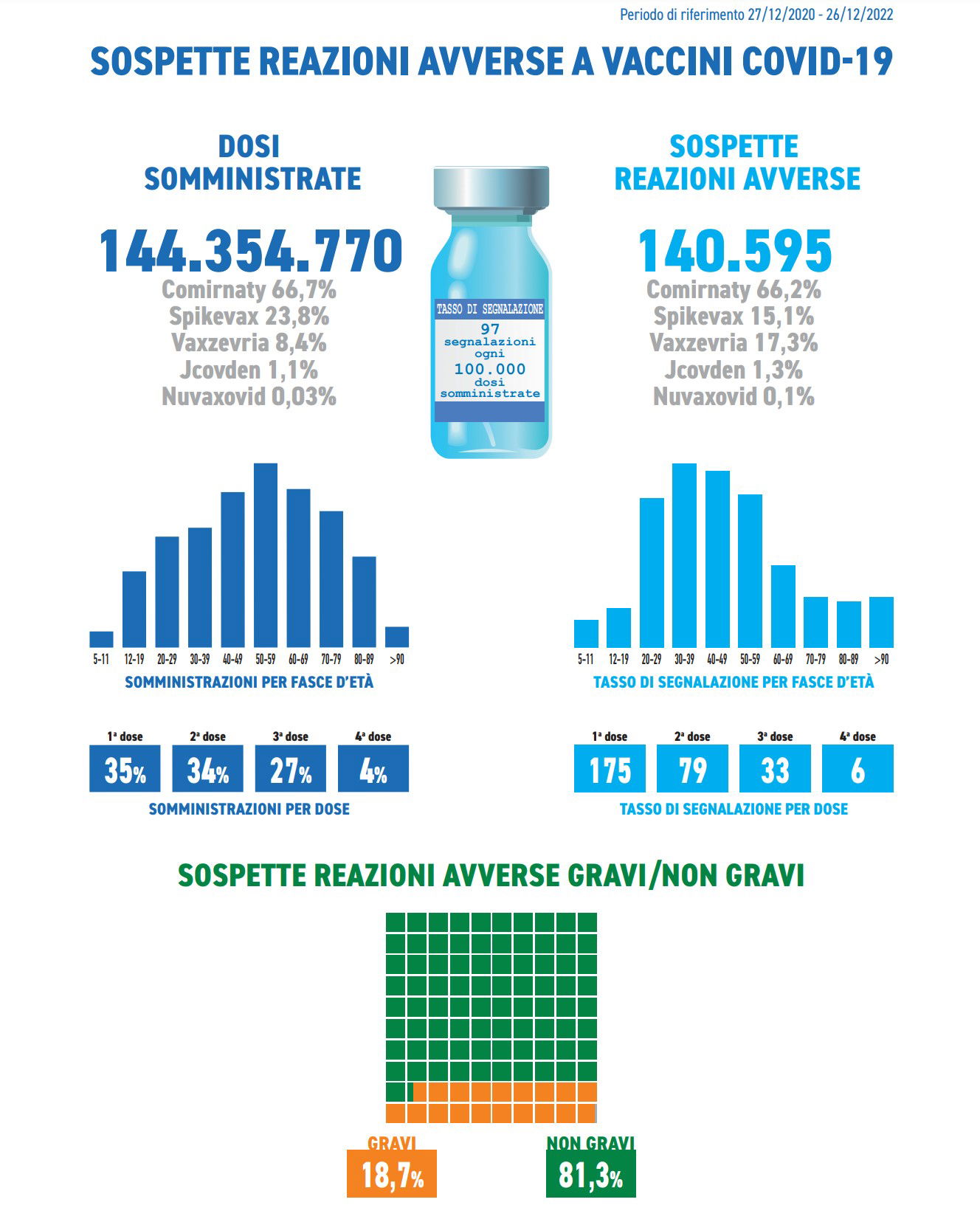 Ma siamo alla dimostrazione della presa per i fondelli. Sì, perché basta andare a prendere uno dei rapporti sugli effetti avversi, e leggere i dati. Si tratta di rapporti pubblici, disponibili sul sito di AIFA, l’ultimo liberamente consultabile è stato pubblicato nel 2023, coi dati delle segnalazioni fino a dicembre 2022. Guardate l’infografica qui sotto: