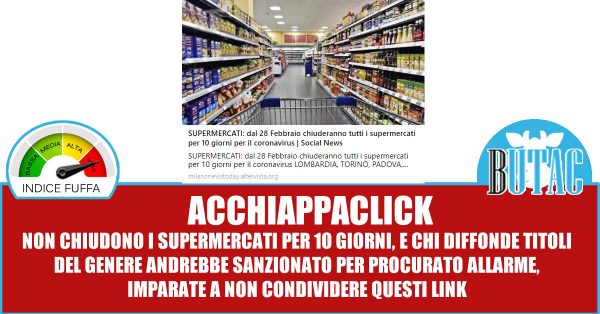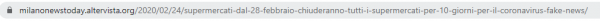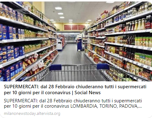 Si tratta ovviamente di una bufala, non c’è nessuna ordinanza di chiusura dei supermercati su Milano, ma un titolone così, nell’ansia da CoVid-19, viene condiviso a manetta. E la gente ci casca e corre al supermercato a fare ulteriore incetta di prodotti di vario genere.