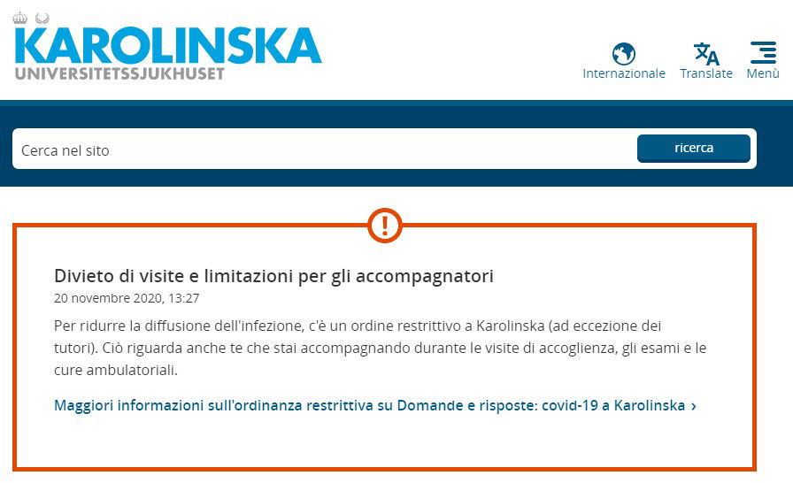 Per ridurre la diffusione dell’infezione, c’è un ordine restrittivo a Karolinska (ad eccezione dei tutori). Ciò riguarda anche te che stai accompagnando durante le visite di accoglienza, gli esami e le cure ambulatoriali.