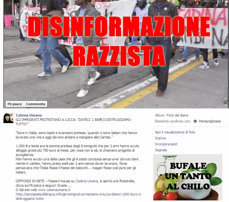 La paginetta Facebook Catena Umana si dimostra ancora una volte fonte di razzismo gratuito e disinformazione. Per accrescere lo sdegno nei confronti degli immigrati nel nostro paese vanno a ripescare una notizia (in buona parte vera) di marzo 2013, la ripuliscono, la gonfiano e la rendono attuale come se fosse avvenuta ieri, tutto ciò nella mia modesta opinione è VERGOGNOSO!