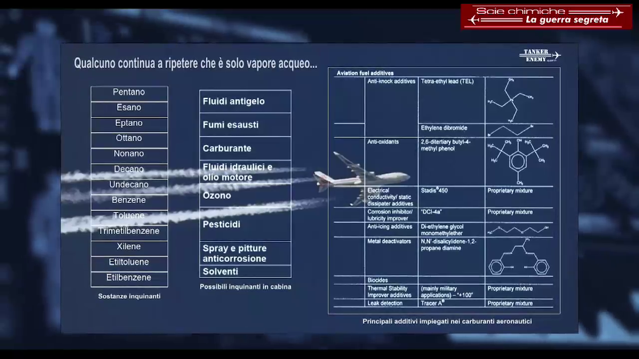 Ma ecco il colpo di scena: la geoingegneria marina, che decima il plancton e uccide i cetacei, che si spiaggiano a causa dei segnali radar dei sottomarini. Segue un’altra grossa fetta di balle, per arrivare finalmente ad uno dei pezzi forti: il prelievo in cabina di un aereo di una compagnia low cost! In cui, ma tu guarda che strano, c’erano sostanze metalliche! In una cabina d’aereo? Noooo, e chi se lo aspettava!
