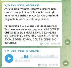 Il tizio che parla e ci racconta di questa mamma, Irene, è evidente che non sa cosa dire, dopo un minuto di nulla ci spiega che Irene si sarebbe accorta che “dall’iOS compare nella scansione del suo GreenPass, compaiono queste due rate da pagare per le uniche due tasse che non abbiamo pagato, compiaono queste due tasse da pagare nell’applicazione del greenpass”. Se devi fare un audio di un minuto e mezzo e ti perdi a dire una semplice frase forse sarebbe il caso che te la scrivessi su un foglietto e la leggessi…