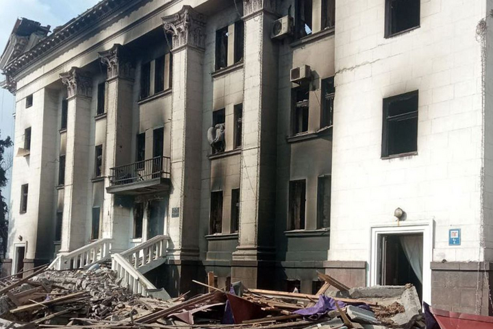 Si tratta del teatro centrale di Mariupol, non della sede della filarmonica, e il suo interno è stato sventrato dalle bombe: