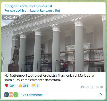 Testo del post di Bianchi: Nel frattempo il teatro dell’orchestra filarmonica di Mariupol è stato quasi completamente ricostruito.