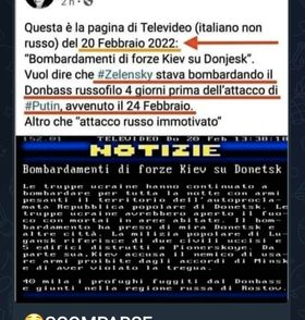 Questa è la pagina di Televideo (italiano non russo) del 20 Febbraio 2022:“Bombardamenti di forze Kiev su Donjesk”.Vuol dire che #Zelensky stava bombardando il Donbass russofilo 4 giorni prima dell’attacco di #Putin, avvenuto il 24 Febbraio.Bombardamenti che sono stati intensificati dal mese di Dicembre 2021, con migliaia di cittadini del Donbass che sono stati evacuati in Russia.Altro che “attacco russo immotivato”!